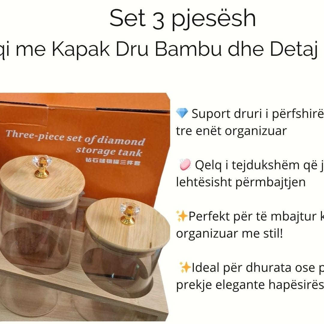 Ky set 3 pjesësh qelqi me kapak bambu dhe detaj kristali